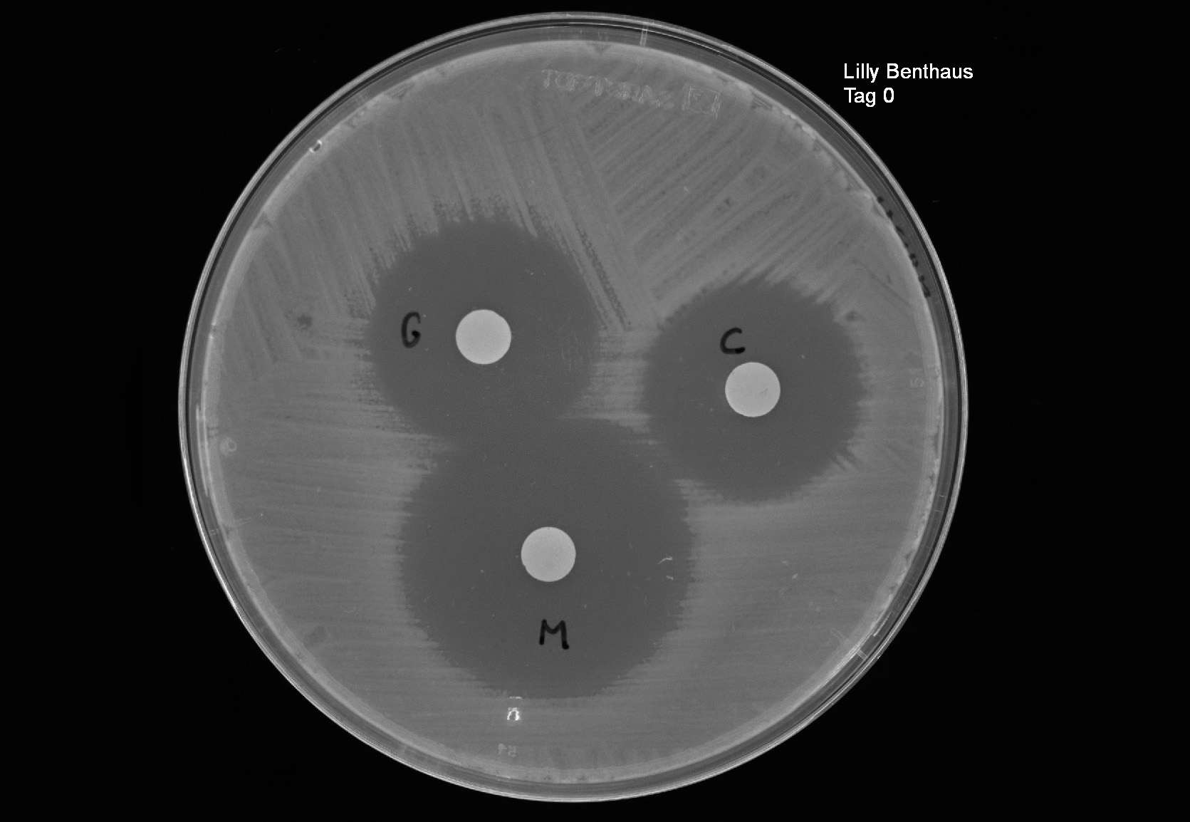 Nach der Identifikation wird das Bakterium gegen die potentiellen Antibiotika getestet. Wenn ein Medikament im Labor nicht mehr genug Bakterien abtöten, gilt der Stamm als resistent und das Medikament kann bei diesem Patienten nur noch im Notfall eingesetzt werden. Wie du schon im Mikrobiologischen Methodenkurs gelernt hast, dient der Kirby-Bauer-Test dazu, herauszufinden, gegen welche Antibiotika die Erreger des Patienten sensibel bzw. resistent sind. Verwende dann das Lineal, um den Durchmesser des Hemmhofs zu messen.